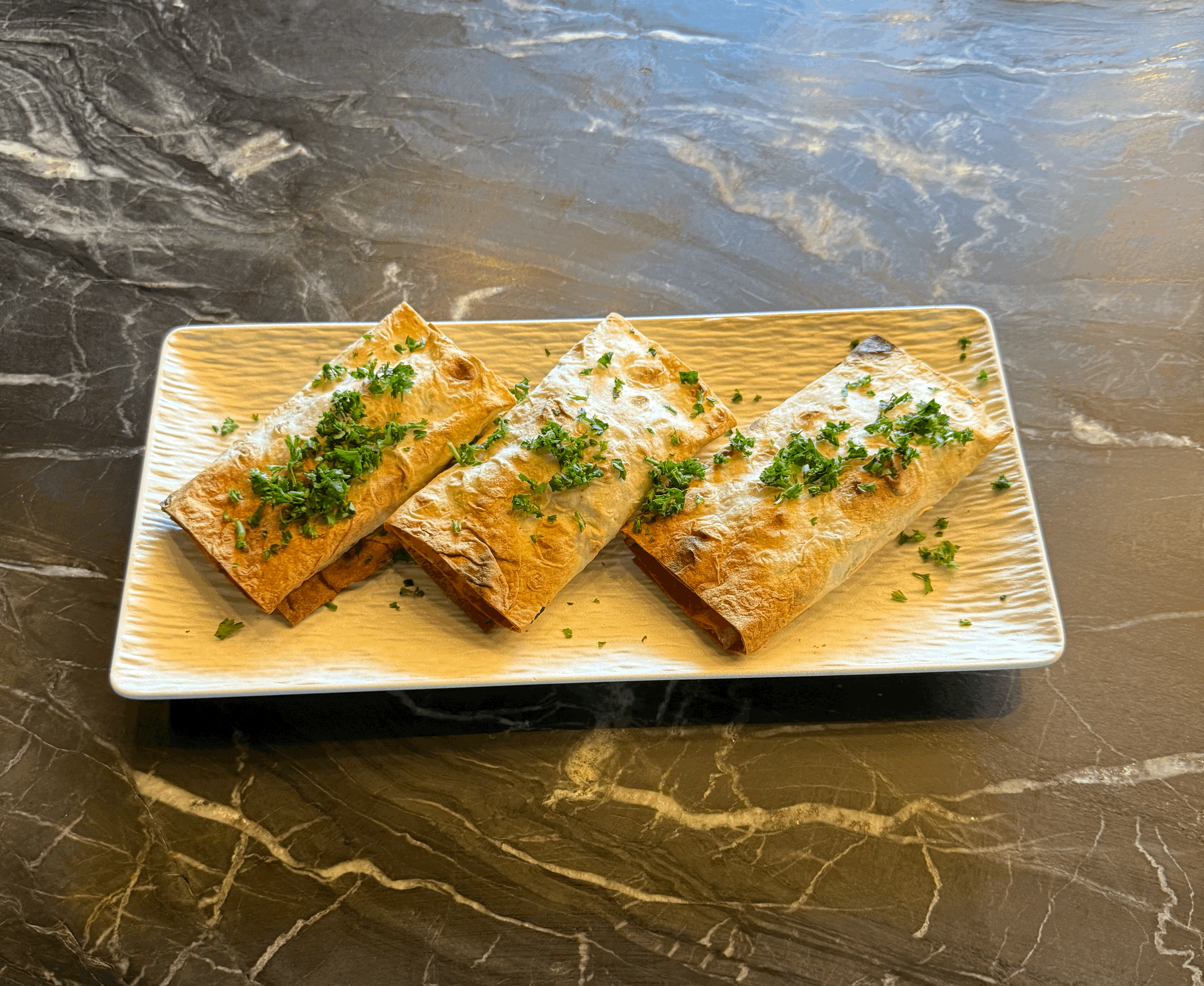 Lavash filled with stretchy suluguni cheese, fresh herbs, juicy tomatoes, and a hint of garlic.